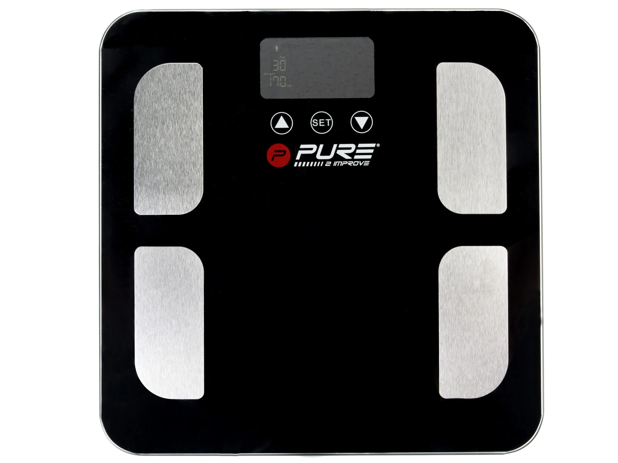 Pure 2Improve Bodyfat nutikaal.Must, P2I logoga, 8mm karastatud klaasiga, maksimaalne kaal 200kg. LCD suurus 82x44mm. Mõõdab keharasva, vett, musklite jagunemist, luumassi, kehamassiindeksit, ainevahetuse määru ja vistseraal hinnangut. Mälu 8-le inimesele. Auto on/off. Jagunemine:0,1kg. Jõud 4×1.5v AAA patareid kaasas.