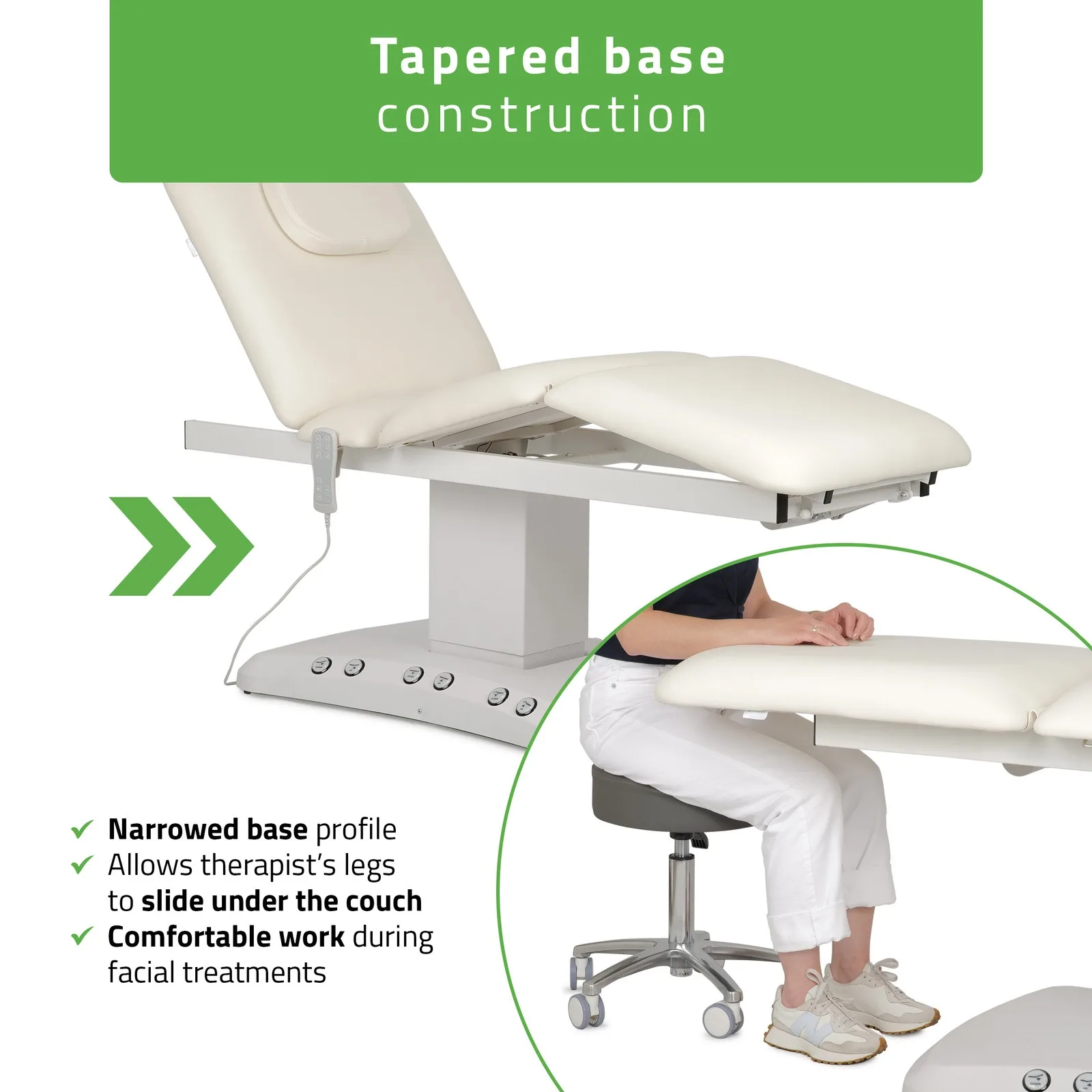 Võimaldab lihtsat ligipääsu peatoele ja loomulikku jalgade asendit täpse töö teostamiseks. -