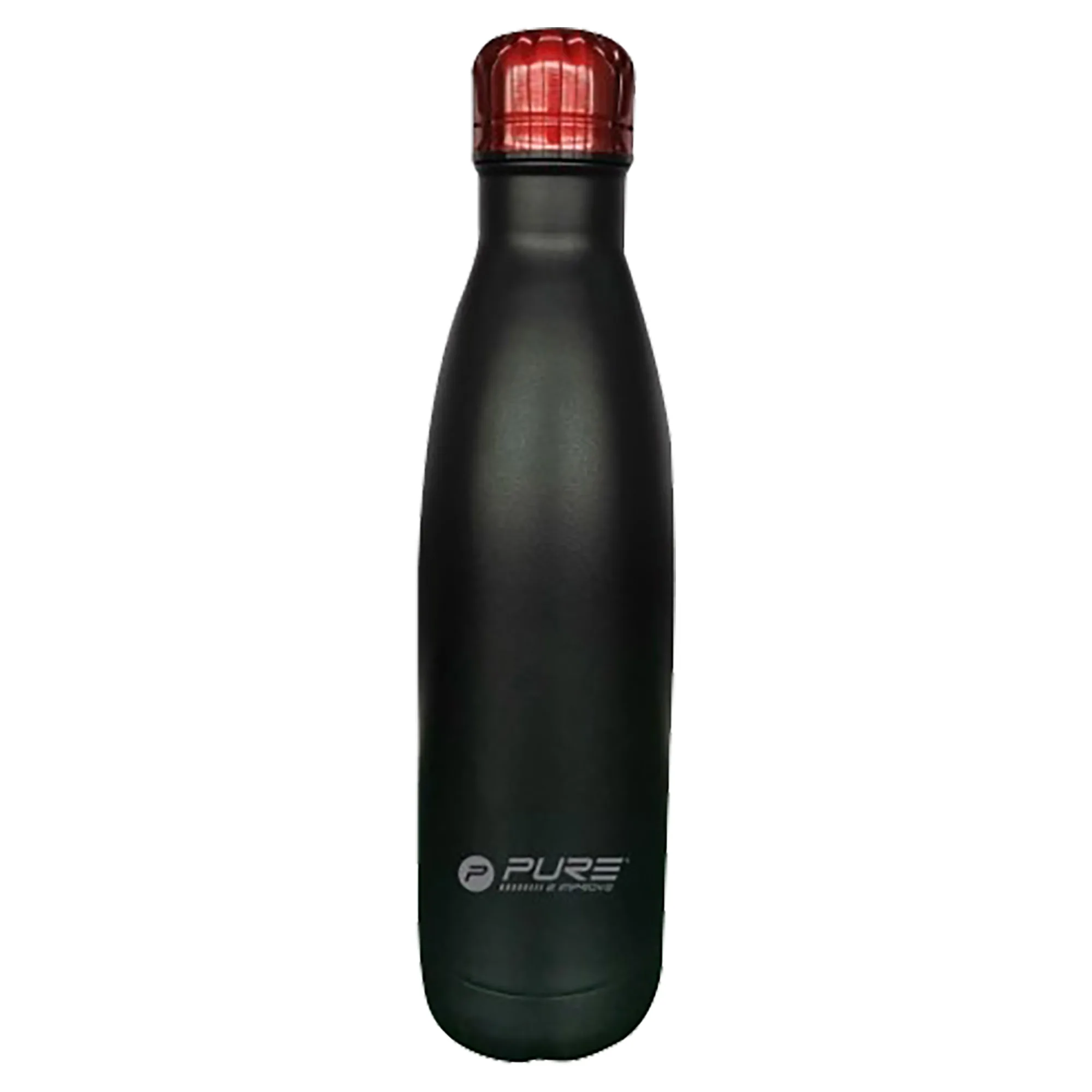 Termos 500 ml vedeliku jaoks. SS kaas ja must silikoonist PP pudel. Pudel on valmistatud metallist ja värvitud pulbervärviga matt mustaks. Metallist lekkekindel kork.