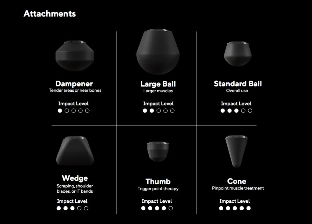 Seadmega on kaasas erinevad otsad, mis on valmistatud just uue põlvkonna TheraGun G3Pro jaoks, et ravida iga lihasgruppi võimalikult täpselt. Need ekspertide poolt välja töötatud lisatarvikud on: tamper, suur pall, standardpall, kiil, pöial ja koonus. Kõik liiguvuad sujuvalt üle naha ja riiete. Otsikud on poolpehmest materjalist.
